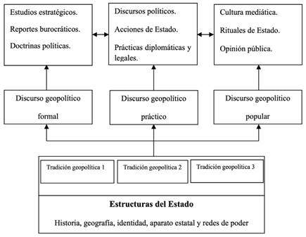 Los geopolíticos críticos han dividido el discurso geopolítico en tres tipos (ver figura 1): (i) la geopolítica formal, que abarca las teorías avanzadas de la geopolítica y las perspectivas creadas por los líderes e intelectuales de Estado; (ii) la geopolítica práctica, que hace mención a las narraciones utilizadas por los tomadores de decisión política y los políticos en la práctica real de la política exterior; las formas públicas de estos guiones -en los discursos y las alocuciones públicas- son la materia prima de la geopolítica práctica; y (iii) la geopolítica popular, que está interesada en las narraciones del mundo político que son expresadas en la cultura popular del Estado, sobre todo desde el sesgo del cine, las novelas y las caricaturas (Ó Tuathail, Dalby y Routledge, 2006, p. 9).