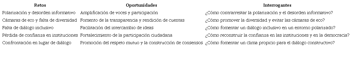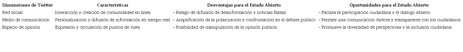 A continuación, se presenta una tabla con los retos, oportunidades e interrogantes relacionados con Twitter en el contexto del Estado Abierto.