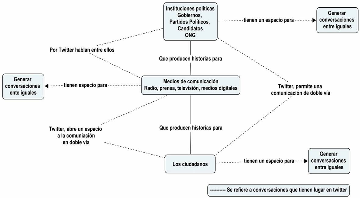 Los medios de comunicación también desempeñan un papel relevante en Twitter, ya que utilizan esta plataforma como fuente de información y le otorgan cada vez más importancia a los hashtags y tendencias que surgen a partir de las interacciones entre los actores de la comunicación política y gubernamental. No obstante, es importante reconocer que Twitter no es un escenario deliberativo en el sentido de ser un espacio para el discernimiento y el pensamiento individual. Más bien, se trata de un espacio en el cual las opiniones compiten constantemente por convertirse en la tendencia del momento, convirtiendo a las personas y sus opiniones en productos de consumo que buscan evitar la obsolescencia al convertirse en el mensaje dominante.