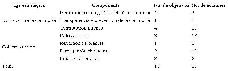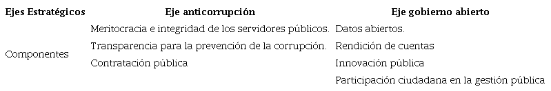 Por su parte, la segunda línea estratégica orientada al gobierno abierto prioriza los componentes planteados en la Carta Iberoamérica de Gobierno Abierto aprobada por la XVII Conferencia Iberoamericana de Ministras y Ministros de Administración Pública y Reforma del Estado (CLAD, 2016), la cual definió al gobierno abierto como