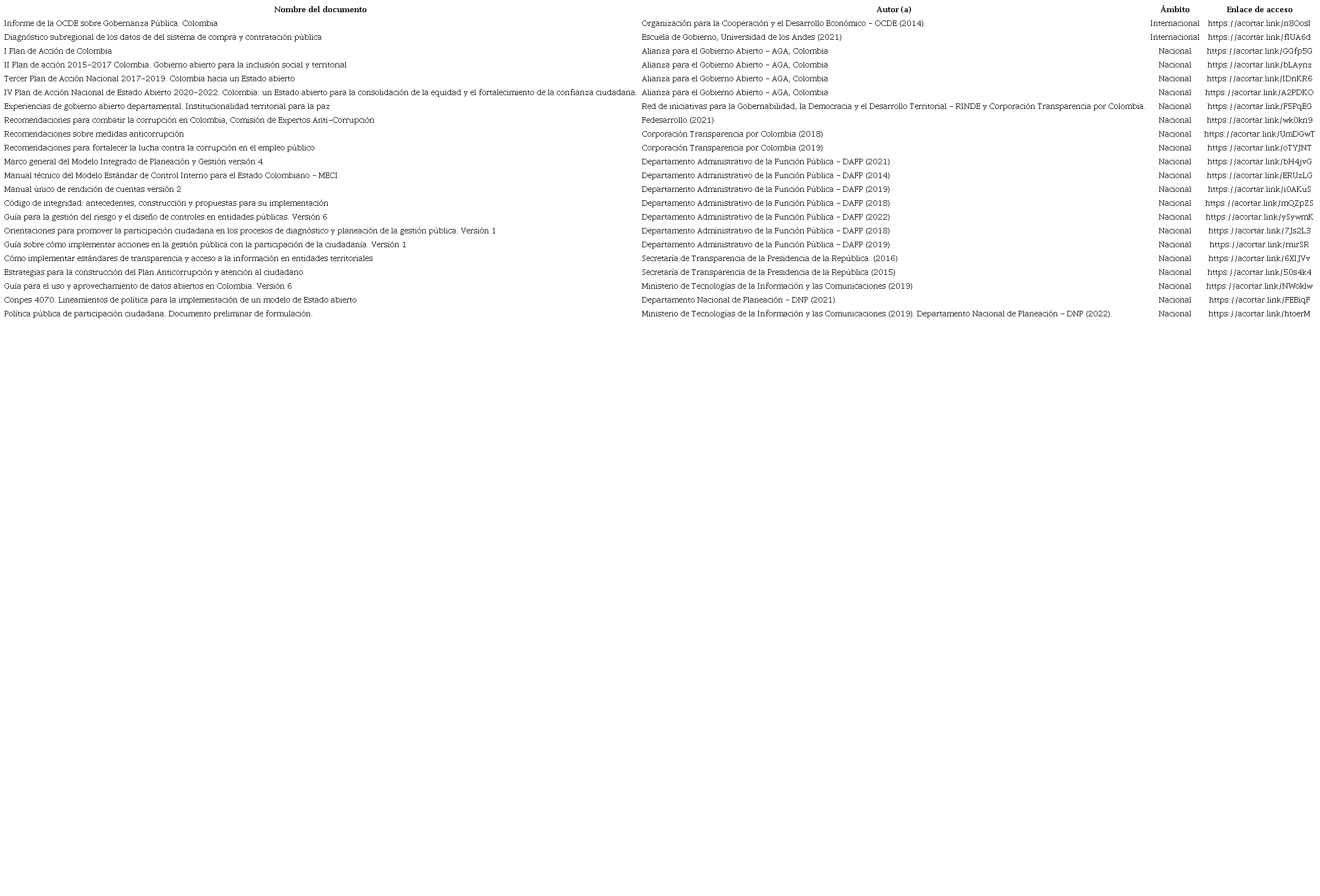 Para la revisión del estado del arte sobre el marco normativo y los principales lineamientos a nivel nacional e internacional en materia de gobierno abierto y lucha contra la corrupción, se priorizaron los siguientes documentos: