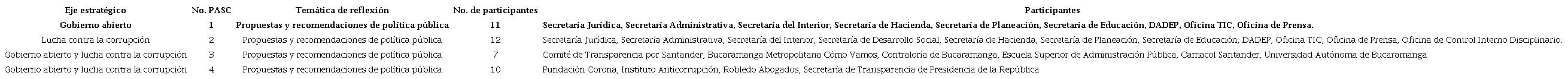 Por otra parte, el equipo técnico de formulación estuvo integrado por investigadores y asesores del Instituto de Estudios Políticos (IEP) de la Universidad Autónoma de Bucaramanga (UNAB), la Fundación Corona, la Red Santandereana por la Transparencia y el Comité de Transparencia por Santander, encargados del diseño metodológico, el análisis de los resultados, la construcción del diagnóstico, la formulación del componente estratégico, la definición de ejes, sub ejes, acciones y metas de la política pública.