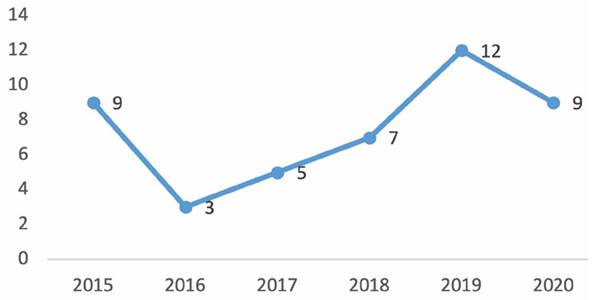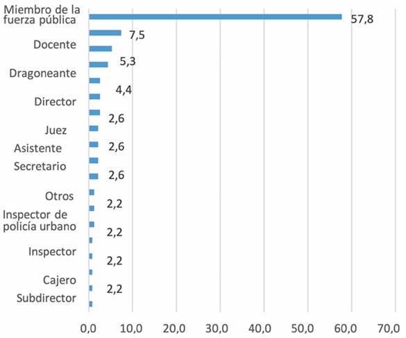 Por otra parte, se evidenciaron riesgos de corrupción por el alto índice de sanciones disciplinarias contra la fuerza pública y los docentes, tanto en el nivel municipal como en el nacional. Según datos del Observatorio de Transparencia y Anticorrupción de la Secretaría de Transparencia de la Presidencia de la República (2021b) y el Sistema de Registro de Inhabilidades (SIRI) de la Procuraduría General de la Nación, entre 2015 y 2020 el 57% de las sanciones disciplinarias en Bucaramanga tuvieron como responsable a un miembro de la fuerza pública y en segundo lugar los docentes de instituciones educativas oficiales con el 7,5% de los casos (Figura 2).