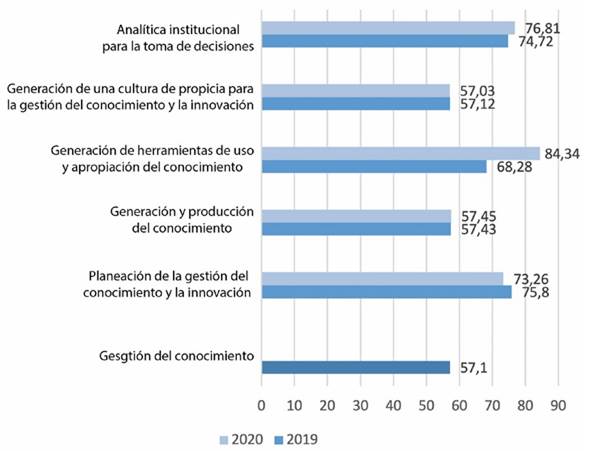 El Índice de Desempeño Institucional (IDI), ofrece algunos indicadores que pueden ayudar a caracterizar los procesos de innovación en las entidades públicas. En la Alcaldía de Bucaramanga, entre el año 2019 y 2020, se han presentado resultados variables y un rezago en indicadores relacionados con la generación de una cultura propicia para la gestión del conocimiento y la innovación y para la generación y producción del conocimiento (Figura 3).