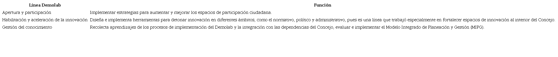 El laboratorio nace en el año 2020 como una apuesta para la materialización de una agenda de Parlamento Abierto dentro del Concejo de Bogotá. La creación de una unidad enfocada en la innovación dentro de la institución, que cuente con capacidades técnicas, metodológicas y presupuéstales, abre, entre otras, la posibilidad de romper barreras de la participación ciudadana. La iniciativa surge de una alianza entre la institucionalidad y la sociedad civil, lo que más adelante se explicará bajo el concepto de gobernanza mixta; y que plasma sus objetivos y metas en el Plan cuatrienal del Concejo de Bogotá (2020-2023)3. El Demolab se constituye como una estructura de innovación que busca mejorar procesos de adentro hacia afuera. Con este objetivo, se diseña una estructura de funcionamiento en tres líneas que fortalecen procesos internos y a su vez crear capacidad para fortalecer la relación institución-ciudadanía.