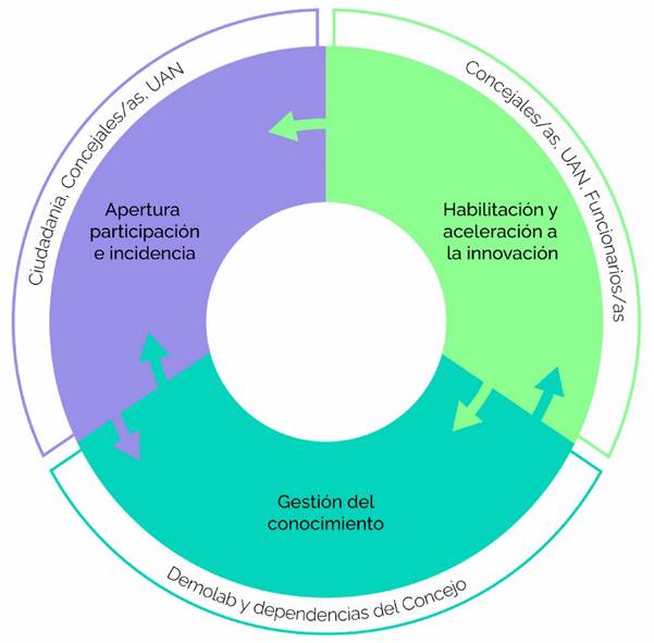 Para atender estas necesidades y apalancar procesos de innovación dentro del Concejo de Bogotá, se conciben dos estrategias puntuales: un modelo de gobernanza mixta y la institucionalización de las acciones del laboratorio.