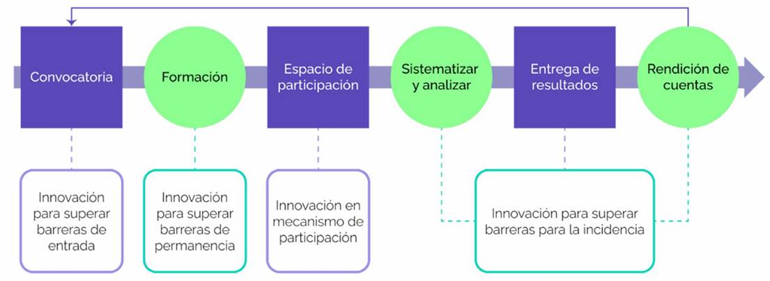 Abordar la participación ciudadana desde una perspectiva de innovación, no solo se trata de nuevos mecanismos para la participación, a su vez requiere de identificar mejoras a los tradicionales para atender a las barreras que tiene la ciudadanía a la hora de participar. Las barreras de participación, como se mencionó anteriormente, son tres: de entrada, de permanencia y de incidencia. Para enfrentar estas barreras, el Demolab identificó la necesidad de reestructurar las fases de la participación ciudadana tradicional, innovando en el proceso de convocatoria, de implementación de los espacios y la recolección de insumos que se toman como resultado de la participación.
