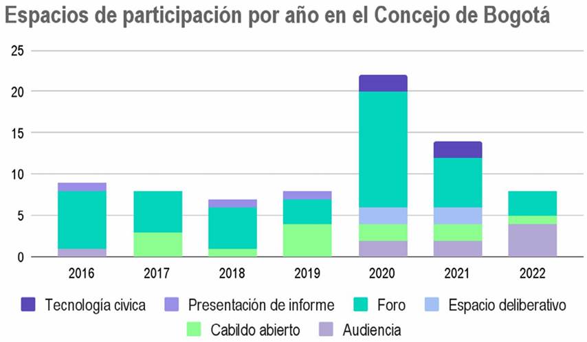 En el año 2020 se presentó un incremento de 6 puntos por encima del promedio del periodo constitucional 2016 a 2019, los espacios de participación ciudadana incrementan como resultado del aumento en el número de foros que tenían el propósito de informar a la ciudadanía sobre las medidas de cuidado para mitigar los efectos del covid-19. Para el año 2021, el número de espacios de participación se redujeron en términos cuantitativos, sin embargo, se implementaron nuevos espacios de participación ciudadana que buscaban involucrar de manera más incidente a las personas en las decisiones de la institución, lo que evidencia en que es el único año en donde se desarrolla una estrategia encaminada a la colaboración entre Concejo y ciudadanía.
