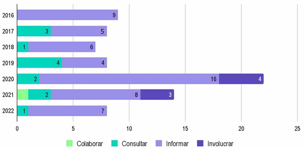 En lo referente al nivel de involucramiento ciudadano de los espacios de participación del Concejo se evidencia que en su mayoría apuntan al nivel de informar, seguido de consultar, como los niveles más básicos de la escalera de involucramiento. Los espacios de participación enfocados en involucrar y colaborar son nulos entre 2016 y 2019, mientras que entre 2020 y 2021 son en número los que le siguen a informar, superando, incluso, a los de consulta. Estos espacios fueron implementados con apoyo del Demolab.