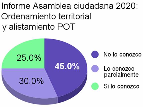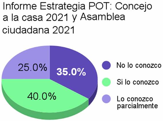 Este aprendizaje permite que la presentación de los resultados contemple otros recursos; por ejemplo, se elaboró un primer informe técnico que incluía en detalle las percepciones de la ciudadanía en cada una de las comisiones y, un segundo informe ejecutivo, que clasificaba cada uno de los aportes de los diferentes espacios de participación pertenecientes a La Ruta POT, en las estrategias del POT propuestas. La presentación de estos resultados pudo facilitar su apropiación por parte de concejales y ciudadanía, así como integrarlas a las discusiones pertinentes; lo anterior también se ve reflejado en un aumento en la proporción de concejales y UAN consultadas que manifestaron conocer el informe.