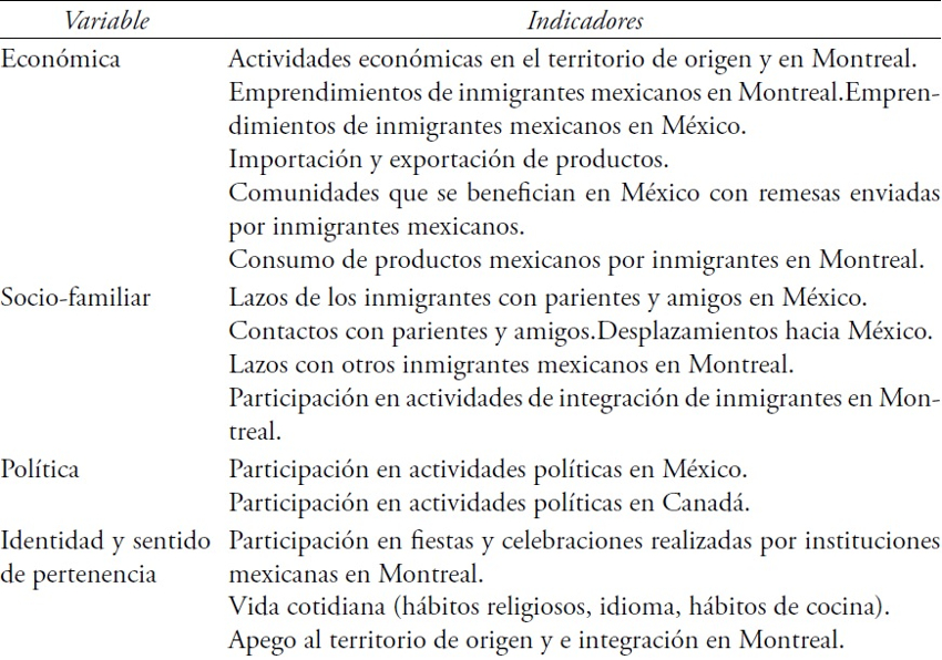 En nuestra investigación empírica, hemos tenido en cuenta variables económicas, políticas, socio-familiares y de identidad de los inmigrantes. La variable económica corresponde al conocimiento que poseen los inmigrantes acerca de las posibilidades económicas que ofrecen la ciudad de Montreal, la Provincia de Quebec y Canadá; la variable socio-familiar trata de los lazos entre los inmigrantes con su territorio de origen y con la sociedad en la que residen; la variable política se refiere a la participación de los inmigrantes en instancias políticas en México y en Canadá; y la variable de identidad corresponde al sentimiento de pertenencia de los inmigrantes mexicanos con respecto al territorio de origen y al medio montrealés. Estas variables se han desglosado en indicadores más finos, como se muestra en la tabla 1.
