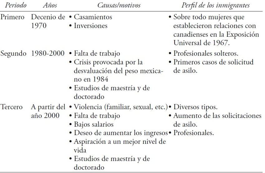 De los 12,925 inmigrantes con residencia permanente, 7030 han llegado a Canadá después del año 2006 y, por extensión, los que no poseen la residencia también están en Canadá desde hace pocos años. Esto significa que del total de los mexicanos asentados en Montreal, 66,3% tiene menos de 10 años de residencia. No es extraño entonces que esta comunidad no muestre signos de madurez institucional y organizacional. En esta sección presentaremos un perfil general de estos inmigrantes. Primero, nos referiremos a los periodos de emigración y posteriormente describiremos sus características generales.