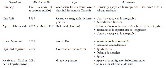 Un aspecto importante en el análisis de una comunidad es el de las organizaciones que la estructuran. Diversos tipos de organización tienden a jugar este papel en el caso de los inmigrantes mexicanos en Montreal.