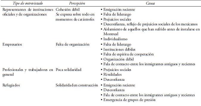 Según la apreciación de los entrevistados, los mexicanos en Montreal no constituyen aún una comunidad organizada. Para la mayoría, las relaciones y las redes entre ellos se estructuran en función del periodo migratorio y del estatus social y jurídico (tabla 4). Los inmigrantes instalados entre 1970 y 1980 tienen pocas relaciones con los que llegaron en 2000. Un empresario expresa lo siguiente: