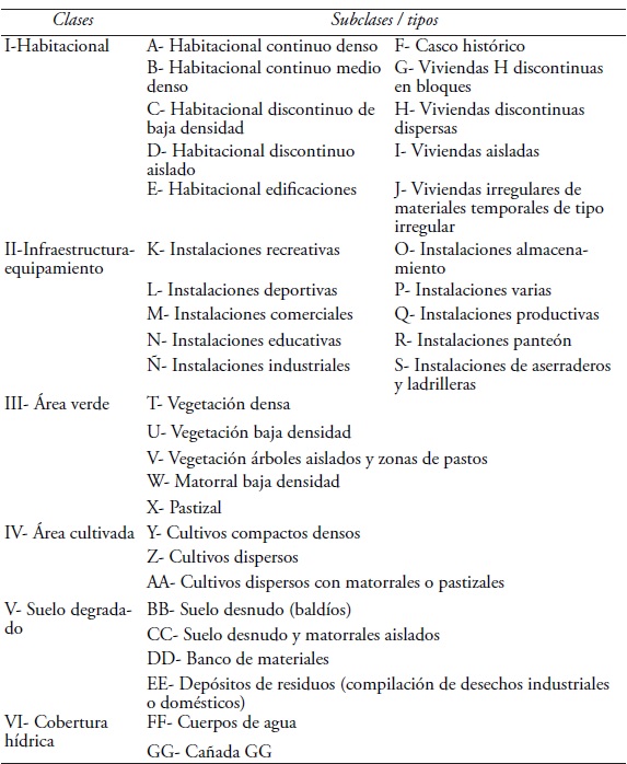 Establecida la tipología se procedió a realizar la digitalización de las clases y los tipos de cada cobertura y usos del suelo, mediante la interpretación visual y la verificación en campo. Como resultado se digitalizaron 783 polígonos que se agrupan en las seis clases y 34 usos del suelo, establecidos en la tipología, respectivamente (cuadro 2). Luego se procedió a la compilación del mapa de coberturas terrestres y usos de suelo del territorio de estudio.