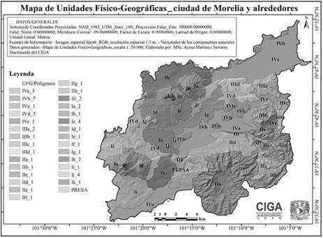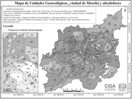 Zona Urbana: Las unidades geoecológicas urbanas constituyen 410 polígonos del total obtenido para el área (783), y una superficie de 94,98 Km2. Para su descripción se tiene en cuenta la caracterización general por paisaje físico-geográfico y tipología de cobertura terrestre y uso del suelo que representan; ocupan parte de las cuatro localidades, representadas por 15 comarcas físico-geográficas del territorio: I d, I e, I f, I g, II a, II d, II i, III a, III b, III c, III d, IV a, IV b, IV c y IV d. Esto representa un total de 408 polígonos, con el predominio de las unidades físico-geográficas; IV a, I g, II d y IV b, por lo que la zona urbana se caracteriza principalmente por ocupar el fondo del valle fluvial del Río Grande de Morelia, amplio, con depósitos superficiales fluviales y lavas volcánicas basálticas e ignimbritas, pendientes planas a muy suavemente inclinadas (1°-3°), con restos de terrazas fluviales erosivas sobre suelos vertisoles y phaeozem.