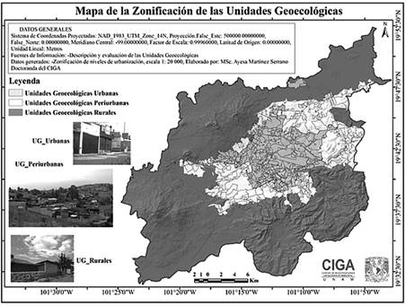 En el paso siguiente se superponen las UG con la clase de cobertura/uso, vegetación y áreas cultivadas. A partir de los límites de las unidades geoecológicas que conforman esta capa, se establecen los límites entre las zonas periurbana y rural del área de estudio, por medio del análisis de localización, distribución e interacción de las UG en el ambiente SIG. El límite externo de la zona rural es el linde del área de estudio. De tal manera, el análisis espacial de las UG en el área de aplicación nos permite establecer la zonificación del territorio que ocupa la ciudad y su entorno.