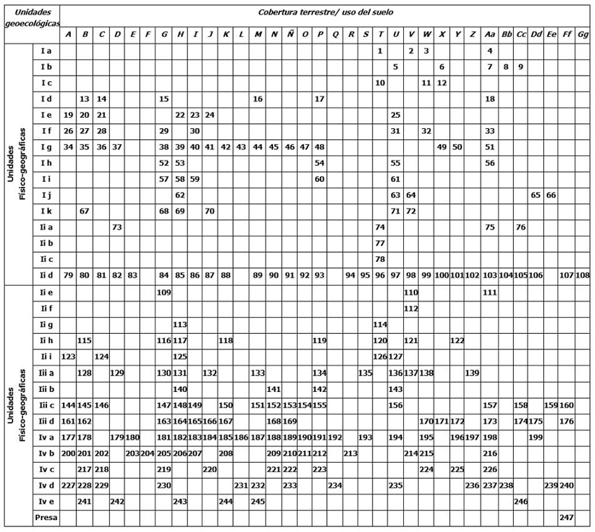 Esto permitió identificar clases y subclases en términos de cobertura terrestre y los diferentes tipos en función del uso del suelo. Se realiza el cruce de las unidades de paisajes físico-geográficos y la tipología de cobertura/uso de suelos, por medio de la superposición de los mapas resultantes de la cartografía de ambos temas. Se obtiene así el mapa de unidades geoecológicas y su leyenda, la cual muestra las unidades geoecológicas mediante el método matricial, en la vertical de la matriz se presentan las comarcas de paisajes físico-geográficos y en la horizontal las clases y tipos de cobertura/uso del territorio. El procedimiento culmina con la compilación cartográfica de las UG en el área de estudio y recorridos de campo por todas las unidades geoecológicas, en las que se obtuvo importante información, lo que permitió realizar una descripción de cada una de ellas.