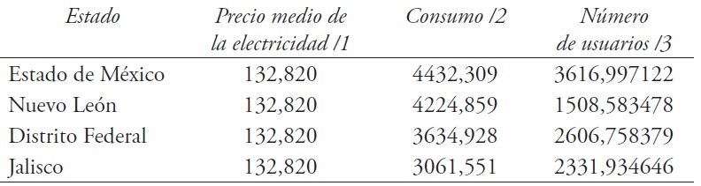 La concentración de usuarios que presenta el sector residencial lo convierte en uno de los sectores con mayor sensibilidad a la implementación de nuevas reformas o políticas que podrían generar cambios en uno o varios de los determinantes de su demanda. Es precisamente en el sector residencial donde existe una escasez de estudios económicos a propósito de la demanda de energía eléctrica a nivel nacional y estatal, particularmente en aquellos estados donde cambios en el precio u otro de sus determinantes tendrían un mayor impacto en el corto o largo plazo, dadas sus condiciones socioeconómicas (Maqueda-Zamora y Sánchez-Viveros, 2011). Según datos del SIE, en 2013 el Estado de México fue el estado con mayor consumo residencial y con mayor número de usuarios (cuadro 2).