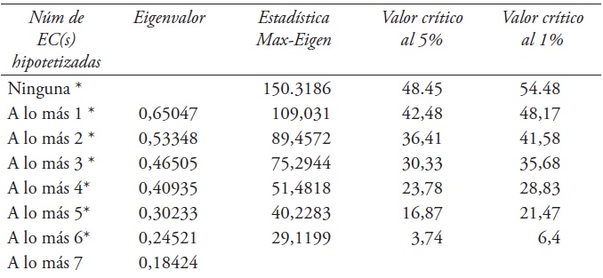 La prueba de máximo eigenvalor mostrada en el cuadro 7 prueba la hipótesis nula de que el rango de cointegración es igual a r=0 contra que es mayor que 0. Dado que el valor del estadístico de máximo eigenvalor (109,031) es mayor que el valor crítico a 1% (48,17), se rechaza la hipótesis nula de que el rango de cointegración es igual a 1 (Greene, 2003). Basado en ambos resultados se concluye que existe más de una relación de cointegración entre el conjunto de series de tiempo incluidas en el modelo.