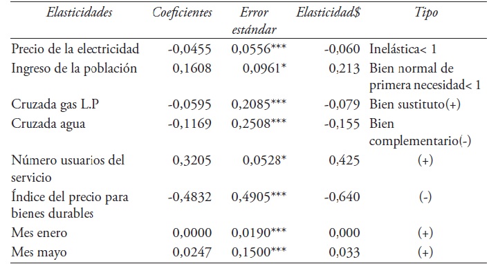 En el caso de las elasticidades cruzadas, los resultados indican que el servicio público del agua es un servicio complementario al servicio eléctrico residencial en el corto plazo (-0,71). Con respecto a la elasticidad cruzada del precio del gas, ésta variable resultó no ser significativa en ambos horizontes de tiempo: largo y corto plazo.