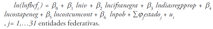 Para probar lo anterior, se utiliza un modelo de panel de datos con información anual para las 32 entidades federativas, cubriendo el periodo de 2009 a 2012. Dicho lapso de análisis se determina de acuerdo con la información disponible y relativamente confiable. En lo posible se utiliza la información proveniente de la base de datos de Imco (2014), ya que se considera que ha sido homogeneizada y tratada por posibles sesgos y lagunas originadas por su diferente origen. Para la información no disponible en la base del Imco se utilizan las fuentes originales.