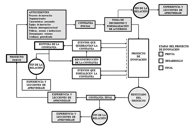 Derivado de la revisión de literatura y las observaciones previas, se diseñó un modelo que emula el proceso de construcción de la confianza. El inicio del modelo comprende los antecedentes del socio así como del entorno en el que se suscribe el proyecto de innovación. Una vez establecidos los antecedentes se genera lo que se llama confianza inicial. Ésta puede ser medida mediante una escala común de confianza según el nivel de análisis que se quiera estudiar. Este nivel inicial permite la toma de decisiones y formalidad de acuerdos. En caso de que no se llegue a un consenso la relación termina, dejando en la memoria una serie de lecciones de aprendizaje y experiencia. En caso de formalizarse la relación, se comienza el proyecto de innovación. El modelo muestra claramente que el proceso de construcción de la confianza consume tiempo y recursos, requiere de experiencia, y está sujeto a altos grados de incertidumbre. Vale la pena tener esto muy presente, a efecto de no generar falsas expectativas en las estrategias pensadas para la generación de innovación.