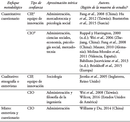 Diez de los 13 artículos de investigación seleccionados optaron por un enfoque metodológico cuantitativo, con información recabada mediante cuestionarios. En un tercio de estos artículos se analizó la confianza interpersonal (CIP), y en el resto, la confianza interorganizacional (CIO).4 Las muestras de estudio provinieron de Suecia, Alemania, España, China y Taiwán.5 Se utilizaron escalas de Likert para medir los constructos y posteriormente aplicar métodos de análisis, tales como regresiones, correlaciones, factores, componentes principales y modelos de ecuaciones estructurales. Por otro lado, en tres estudios se adoptó una metodología cualitativa con información recopilada por medio de entrevistas o algún tipo de etnografía, con muestras de Inglaterra, Estados Unidos de América y Taiwán. Un tercio de ellos se enfocaron en la confianza interpersonal del equipo de innovación. Esta muestra de artículos sugiere una tendencia hacia el análisis cuantitativo en el estudio de la confianza.