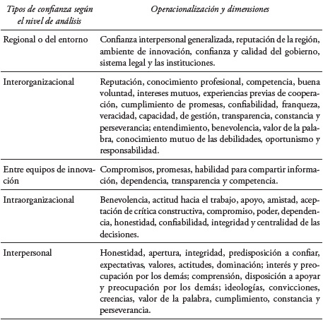 La innovación es un proceso social que depende principalmente de la colaboración de diferentes actores, quienes pueden participar en su desarrollo, implementación o comercialización. El entorno, los recursos, la cultura, el equipo de trabajo, la cooperación efectiva y la confianza son aspectos que determinan la generación de innovación. La confianza es la principal responsable de que se origine un ambiente apto para el intercambio de conocimiento, ideas y para que se disminuya la sensación de incertidumbre y riesgo en la toma de decisiones. En este trabajo se eligió utilizar la palabra confianza para referirse a cualquiera de sus niveles de análisis. De esta manera, la conceptualización de la confianza se expresa como sigue: una decisión que puede variar con el tiempo, está basada en expectativas sobre las intenciones o el comportamiento de los demás, funge como mediadora; y permite la vulnerabilidad y el riesgo en cualquier relación.