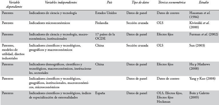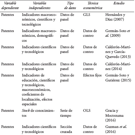 Las variables independientes consideradas son macroeconómicas, institucionales, microeconómicas, indicadores de ciencia y tecnología, demográficos, salud, transporte, geográficos, gobernanza, efectos spillovers, índices de densidad clique, índices de proximidad social interno y externos, índices de proximidad, índices de densidad de inventor. La elaboración de las investigaciones nacionales son actuales y la mayor parte se concentra en las patentes con datos de panel y con modelos econométricos de datos de conteo (Cuadro 2).