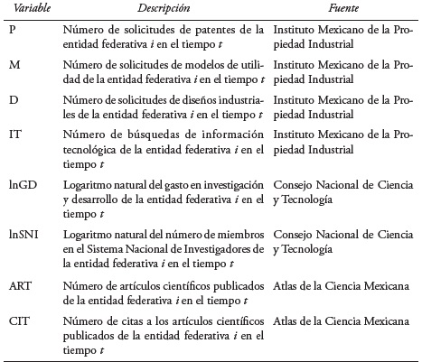 La función producción de conocimiento es modificada y adaptada para tomar en cuenta otras variables que afectan la actividad innovadora. Esta propuesta se basa en los trabajos empíricos nacionales e internacionales como los de Furman et al. (2002), Carayol (2007), Stephan et al. (2007), Hernández y Díaz (2007)Hu y Mathews (2008), Cowan y Zinovyeva (2013), Calderón-Martínez y García-Quevedo (2013), Malva y Carree (2013), Calderón-Martínez (2014), Cozza y Schettino (2015), que han incorporado como factores que influyen en la innovación (patentes), además del gasto en investigación y desarrollo como serie actual, el personal involucrado en el sector científico y tecnológico, las publicaciones científicas y las citas a las mismas.