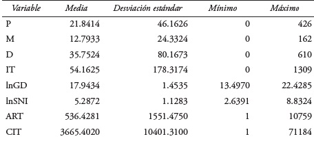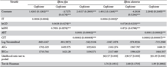 La búsqueda de información tecnológica fue estimada por separado debido a que se encontraron problemas de multicolinealidad con el resto de las variables, ocasionando distorsiones en los estimadores. Los indicadores usados para detectarla son los sugeridos por la literatura como el factor de inflación de la varianza (FIV) y el número de condición. El primer criterio arrojó valores superiores a 10, los cuales no se consideran aceptables. El segundo índice reveló valores por arriba de 20, punto de referencia que no debe excederse para ser admisible (Greene, 2003). El gasto en investigación y desarrollo y el SNI fueron disgregados de los demás por las mismas razones, constituyendo otro modelo. De la misma manera, también los artículos y citas fueron segregados para estructurar otro modelo. Los FIV y los índices del número de condición de ambos resultaron por debajo de 10 y de 20, respectivamente.