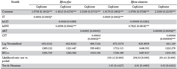 Su signo es acorde con la teoría económica, donde se explica que funciona como dotación de insumo de la creación de ideas y con la literatura que puntualiza la parte empírica (Hausman et al., 1984; Cozza y Schettino, 2015). Sin embargo, en los estudios de Hu y Mathews (2008) desarrollado para China, Cowan y Zinovyeva (2013) elaborado para Italia, demostraron que el gasto en investigación y desarrollo de origen privado es el determinante de la producción de patentes; incluso resultando el gasto público con signo negativo en el primer trabajo.