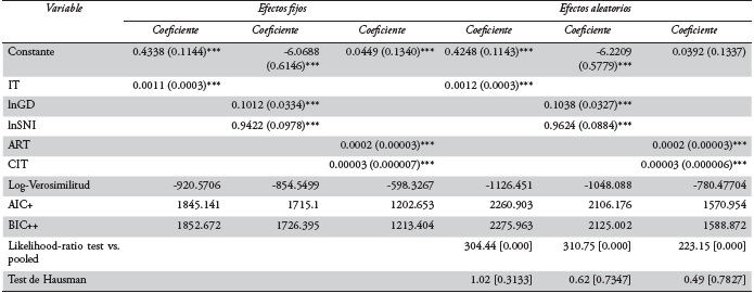 La prueba de Hausman fue realizada para comparar entre efectos aleatorios y efectos fijos, indicando para todas las estimaciones que no se rechaza la hipótesis nula de que no existe correlación entre los efectos individuales y las variables explicativas, por lo que el primer método es consistente y eficiente (Cuadros 6, 7 y 8).