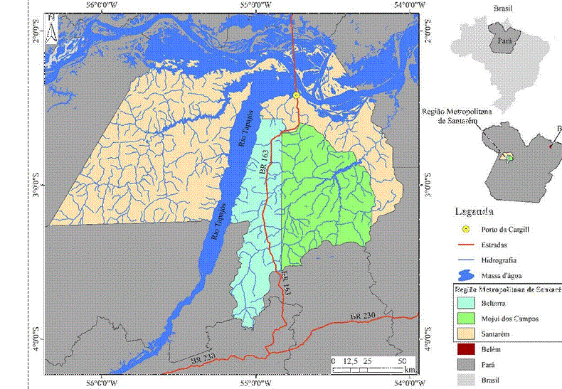 O estudo foi realizado na RM Santarém, localizada na região Oeste do Estado do Pará (Figura 1), distante 697 km (em linha reta) da capital, Belém. A RM Santarém foi é composta pelos municípios de Santarém, Mojuí dos Campos e Belterra, com área total de 27,285,426 km² e 329,197 habitantes (IBGE, 2017b; 2017c2017d).