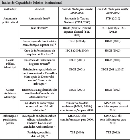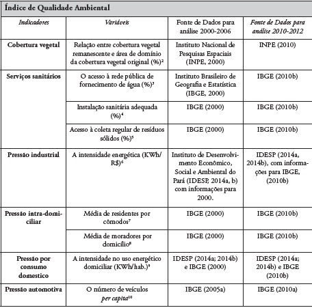 Já o IQA, é composto por oito indicadores, contendo nesse estudo seis indicadores, formados por nove variáveis (Quadro 1); enquanto o Índice de Capacidade Político-institucional (ICP) é composto por quatro indicadores formados por 10 variáveis, (Quadro 2). Destaca-se que o uso parcial das variáveis indicadas por Braga (2006) para esses indicadores, se deu em detrimento da ausência de informações existentes (e.g. qualidade de recursos hídricos), ou inextintas para os dois períodos estudados (e.g. taxa de habitações subnormais).