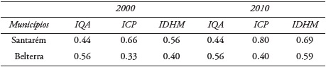 Há uma relação inversa entre ICP e IQA para os municípios de Belterra e Santarém, onde o Belterra, que obteve maior IQA apresentou menor ICP, enquanto Santarém, com menor IQA apresentou melhor ICP. O índice de qualidade ambiental é capaz de mensurar a qualidade do ambiente no momento presente, tanto em relação ao ambiente natural (neste trabalho representado pela cobertura vegetal), como ao ambiente construído (serviços sanitários), relacionando objetivos de segurança ambiental e prevenção da degradação (Braga, 2006).