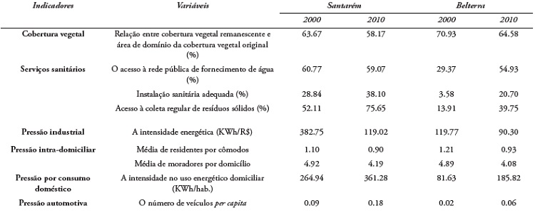 Para o indicador pressão industrial, representado pela variável intensidade energética, também se observa que houve uma diminuição do valor encontrado para os dois municípios entre os anos estudados, sendo que o município de Santarém obteve maior diminuição (68.90%) do que Belterra (24.61%). Esta variável, representa a eficiência energética, expressando o quanto de energia é consumido, para cada real em produção. Braga (2006) destaca que, as indústrias com maior potencial poluidor apresentam geralmente menor eficiência energética. Desta forma, esse indicador mensura de forma indireta, a pressão exercida pelas atividades industriais, sobre a qualidade ambiental e de vida da população desta região metropolitana. Assim, com base nesses resultados, ambos os municípios caminharam positivamente para a sustentabilidade, aumentando a eficiência enérgica da produção municipal.