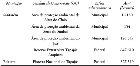 Para o indicador Cobertura vegetal, que expressa a taxa de desmatamento da vegetação original entre os dois anos estudados, os resultados para os municípios foram similares, tendo Santarém uma diminuição de 5.5% e Belterra uma diminuição de 6.35% da cobertura vegetal original em dez anos. Vale destacar que os dois municípios são dotados de Unidades de Conservação (UC) (Tabela 3). Santarém, possui em seu território um total de quatro UC’s, sendo três de esfera administrativa municipal e uma de esfera administrativa Federal compondo ao todo 44.15 % do território municipal. Enquanto Belterra, conta com uma UC de esfera administrativa Federal, a Floresta ocupando 21.6 % do território município municipal.