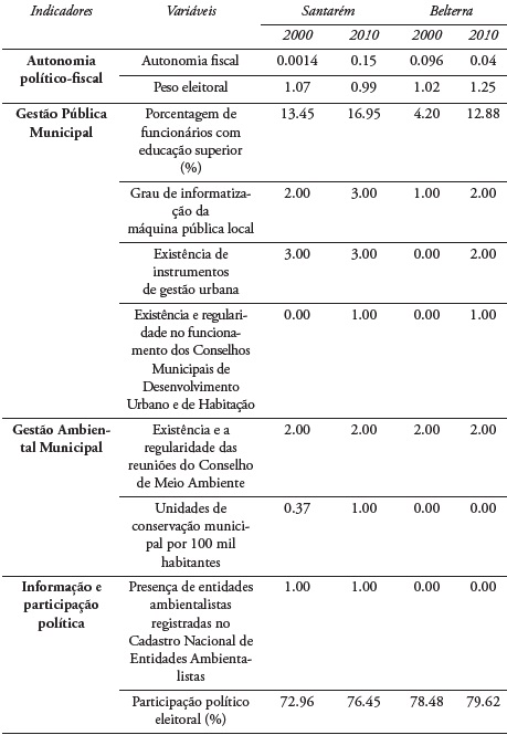 No indicador Gestão Pública Municipal, embora Santarém apresente melhores resultados para todas as variáveis nos dois anos de estudo, o município de Belterra, obteve maior crescimento entre os anos estudados, destaca-se aqui a percentagem de funcionários com educação superior, com incremento de 100%, enquanto Santarém, teve incremento de 50%. Vale a pena ponderar o avanço de Belterra na variável relacionada à existência de instrumentos de gestão urbana. Embora tal evolução não tenha sido suficiente para alterar o indicador de sustentabilidade, do ano 2000 para 2010, constata-se a existência de plano diretor e lei de zoneamento de uso e ocupação do solo.