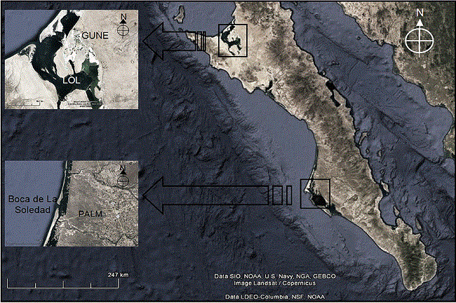 Guerrero Negro (GUNE) se encuentra en la porción media de la Península de Baja California, al sur del paralelo 28º, en el límite noroeste de BCS, entre las coordenadas 27° 57’ 32’’ latitud norte 114° 03’ 22’’ longitud oeste (Figura 1), tiene una extensión aproximada de 700 hectáreas, se localiza dentro de la Reserva de la Biosfera de El Vizcaíno (Rebivi), con una población estimada de 13,000 habitantes (Inegi, 2010).