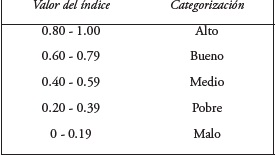Los valores obtenidos a través de la fórmula 2 oscilan entre 0 y 1, el modelo se desarrolló por la UICN (2001) para medir la sustentabilidad en el sector turístico, además, ésta permite realizar comparaciones entre indicadores o componentes sin importar las unidades de medición al transformar los valores a una escala proporcional. Los valores cercanos a 0 indican una situación desfavorable para cada indicador, mientras los valores cercanos a 1 reflejan una situación ideal en el servicio turístico. Se obtuvo el valor medio de cada componente y se categorizó de manera cualitativa de acuerdo al valor obtenido (Tabla 1).