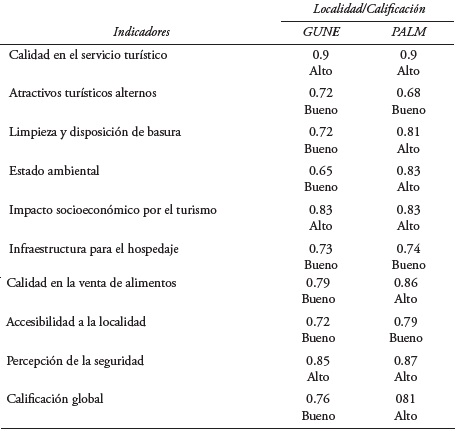Los visitantes se mostraron satisfechos con el servicio turístico recibido en el avistamiento de la ballena gris en ambas localidades, en el PALM, el servicio obtuvo una evaluación alta mientras que en GUNE alcanzó una calificación buena. Las calificaciones para cada indicador en todas las localidades fueron evaluadas como buenas y altas, presentándose diferencias entre algunos indicadores por localidad. Estas diferencias se presentan en la percepción del impacto socioeconómico por el turismo, infraestructura para el hospedaje, el estado del ambiente y calidad en la venta de alimentos (Tabla 2).
