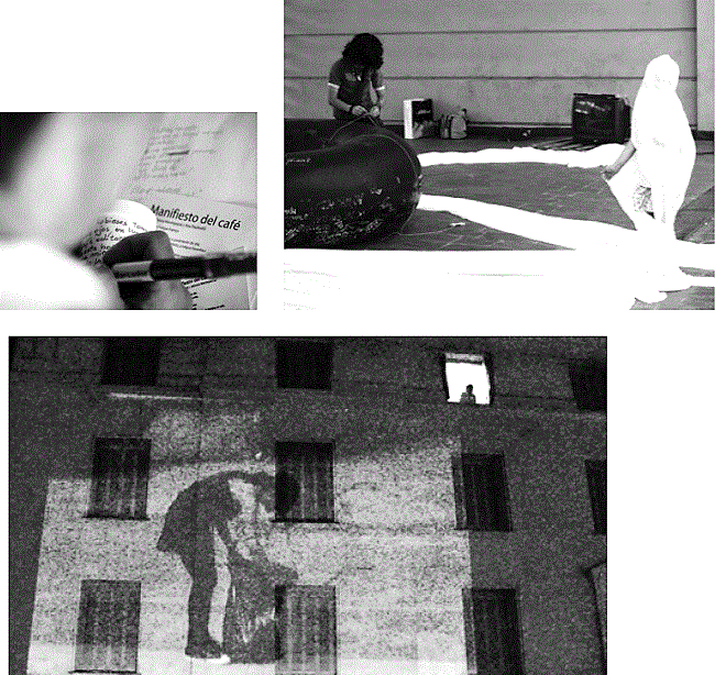 Cotidiano: la rítmica permite leer el presente y el futuro (Han, 2015) a través de una suerte de partitura con repeticiones definitorias (Stavrides, 2016). En este sentido, la irrupción de prácticas diferentes a las habituales altera ese ritmo en una provocación, una búsqueda de intereses que se cruzan entre los personales-individuales y los colectivos-sociales. Se generan en este sentido especies de umbrales (Stavrides, 2007; 2016), zonas intermedias en la que ámbitos supuestamente diferenciados (en términos espaciales, dentro y fuera; en términos jurídicos, la ley y la anomía) pierden sus márgenes y se diluyen uno en el otro. Demostraron en su accionar que buscan un despertar (principalmente, aunque no de manera exclusiva) a partir de lo visual sobre la ciudad cotidiana, como instante que irrumpe y rompe la falsa totalidad de percepción, alterando sus automatismos.