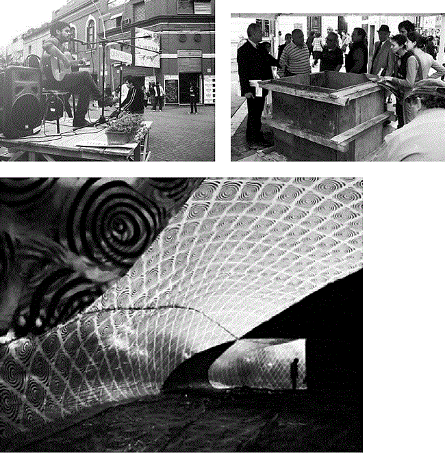 Lugares: generaron una (re)semantización de las preexistencias espaciales y edificadas desde una capacidad interpretativa doble, ya que la ciudad no se ocultó, sino que funcionó como escenografía, escenario, ser y parte de la acción. Se buscó crear espacios menos rígidos, ya sea por advertir algunas de las posibilidades inherentes a determinados lugares o porque crearon por sí mismas esas posibilidades que, en ocasiones, entran en confrontación directa con el uso y las regulaciones que tienden a definir determinados espacios. Se transformaron espacios para una acción que no era considerada como autorizada, institucionalizada o formalizada y para que tengan lugar en ellos encuentros creativos, imprevistos e inesperados, lo que en cierta manera colaboró a soltar o liberar esos espacios, a transformarlos en espacios de carácter intermedio. Su existencia, identificada como umbrales, depende de que sean real o virtualmente cruzados.