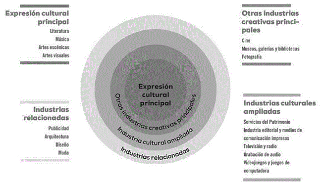 Para el análisis de casos se tomaron como guía y ejes de clasificación los tres niveles de interacción práctica referenciados en el modelo de círculos concéntricos (Figura 1) para el ámbito de las economías creativas planteado por Throsby (2001 y 2008), ya que se considera es, en la actualidad, la sistematización que mejor representa al concepto elegido, tanto por ser el de mayor empleo en los trabajos consultados como por la pertinencia de las clasificaciones asignadas. Además de la clasificación a partir de los círculos concéntricos, se seleccionaron acciones que, en su carácter efímero, al finalizar no dejaran rastros físicos en el espacio urbano público. En este sentido, acciones como grafitis o pinturas políticas se excluyeron para el análisis, sin dejar de reconocer que pertenecen a la clasificación de tácticas ascendentes y creativas, pero con otro nivel de implicación y relación con las preexistencias.