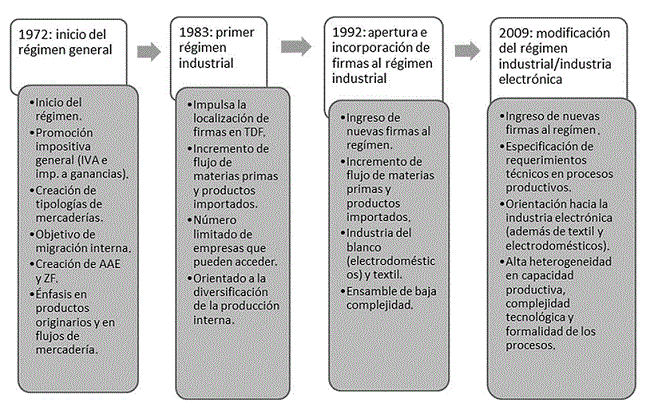 En la Figura 1 pueden identificarse cuatro grandes etapas dentro de la política de promoción industrial en Tierra del Fuego. La primera tiene que ver con la creación del régimen enmarcado en la intención de poblar el territorio, en esta etapa se crea la estructura básica que aún posee la regulación, tanto en términos de las categorías de mercadería (originarias, no originarias y con acreditación de origen), los organismos responsables de reformar y de controlar el régimen (como la Comisión de Regulación) y el establecimiento de la AAE y la Zona Franca.