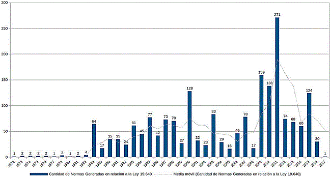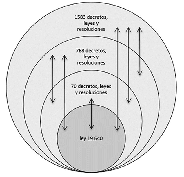 Las normas consideradas se sistematizaron de acuerdo a su vinculación con la ley 19.640 (al tomar en cuenta si la modifican o complementan), en tanto que el primer nivel de relaciones son las 70 normas a las que ésta afecta; cada una de ellas, a su vez, se vincula con otras resoluciones, decretos y leyes que fueron capturados en dos niveles consecutivos, arribando a un total de 2,424 normas. La sistematización se realizó en una base de datos que derivó en la confección de figuras, tablas y resultados agregados que se presentarán en las siguientes secciones.