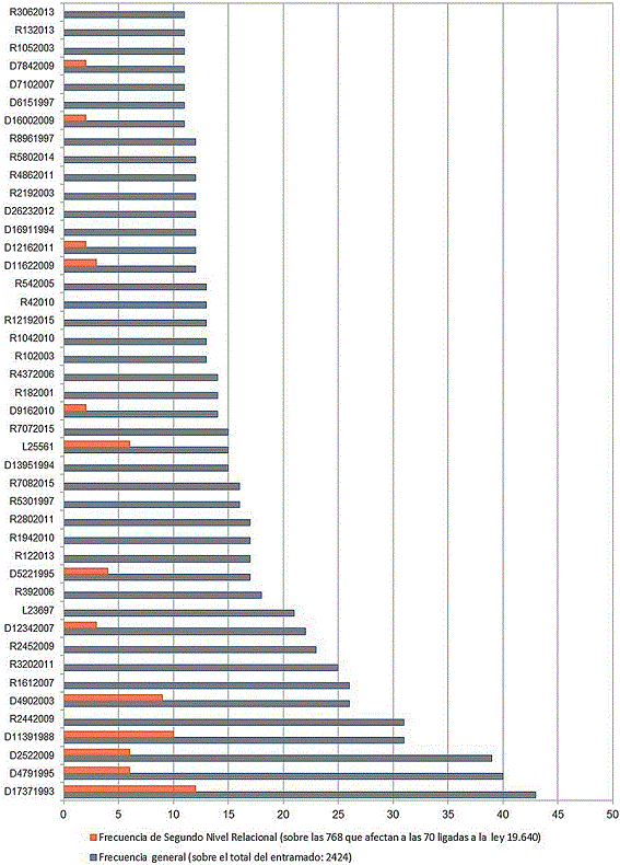 En este análisis se observa la cantidad de apariciones o repeticiones dentro de una base de normas que intervienen en el entramado normativo a que da origen la ley 19.640. A continuación, se presentan dos tipos de indicadores; el primero es la frecuencia general, que considera como universo el total del entramado normativo (2,424 decretos, leyes y resoluciones), en ésta se observa que la última norma de la Figura 4 (decreto 1.737/93) se encuentra modificando o siendo modificada dentro del entramado 43 veces. El segundo indicador describe las frecuencias de las normas que aparecen ligadas en el segundo nivel relacional con la ley 19.640, que están más directamente ligadas a ésta, en comparación con las primeras, (es decir, las 70 normas que afectan a la ley 19.640 se encuentran vinculadas a un grupo de 768 regulaciones, de entre las cuales se destacan las indicadas en la figura como el segundo nivel relacional). Para el decreto anteriormente mencionado, el segundo nivel aparece modificando o siendo modificado 12 veces en el entramado normativo.