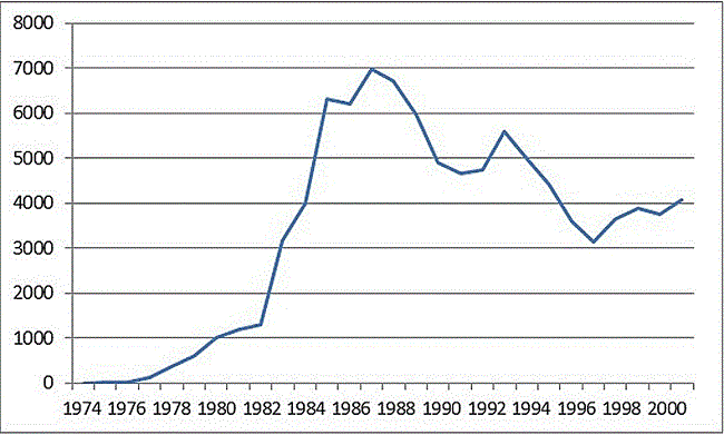 Complementando el análisis de la Figura 4, se evidencia una coincidencia entre momentos de crecimiento/decrecimiento de la actividad industrial y la creación de normas. La Figura 5 muestra la cantidad de empresas promocionadas en la provincia entre el periodo 1974 y 2000.
